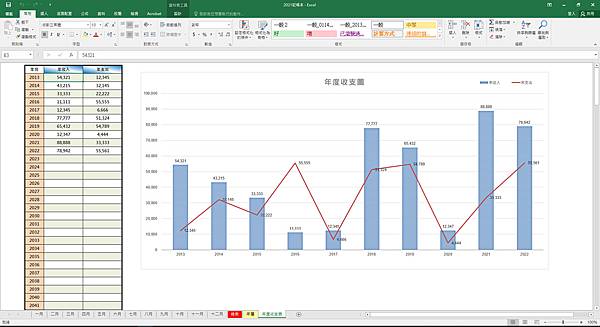 所有的〔年份〕〔年收入〕〔年支出〕可自行更改